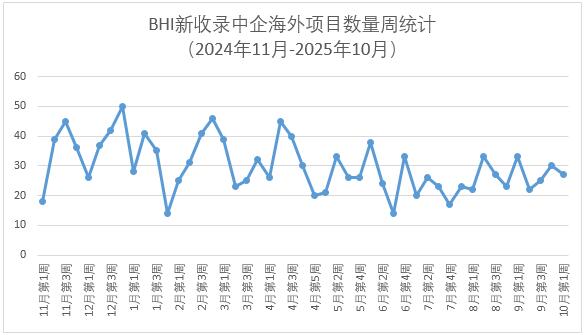 据BHI中企海外项目数据库监测,十一假期前后(9月28日-10月11日)BHI新收录中企新签约/中标/公告海外项目27个。其中中国能建6个项目,中国建材4个项目。2025年新收录项目已超过1100个。近一年每周新收录项目数量趋势统计详见下图。